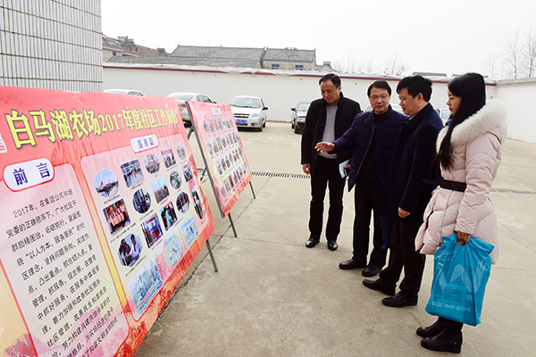 1月19日,由集团公司人力资源部、社会事业部、资产经营部、审计监察部组成的联合考核组一行到白马湖农场对2017年度重点工作完成情况及所取得主要成绩等进行综合考核,农场领导姚春华、韩跃武及相关部门负责人陪同考核并汇报情况。