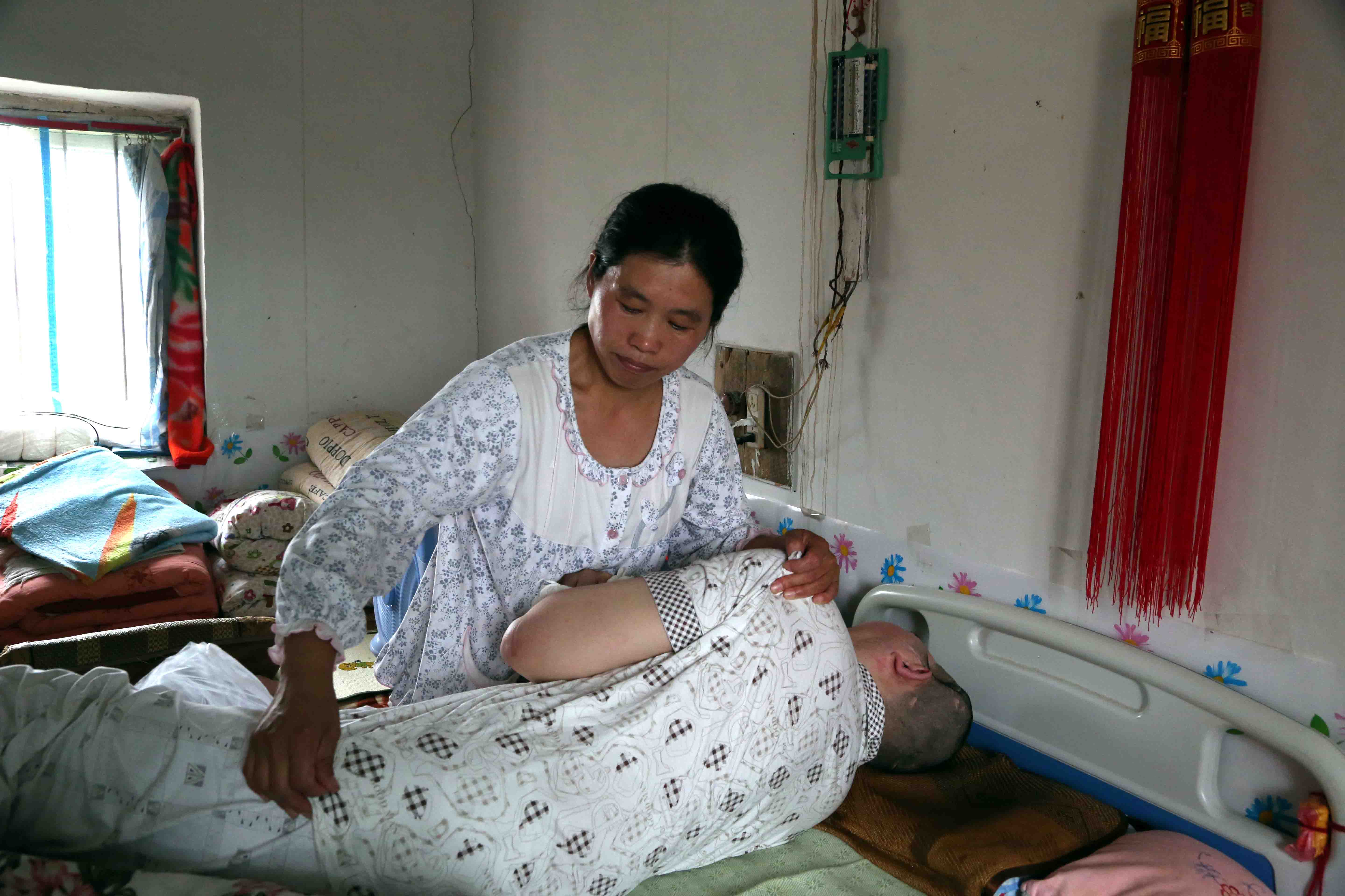 每天天不亮她就起床了,照顾好家里其他人之后,就忙着给丈夫喂饭翻身、换洗衣物,全年无休。担心常年用纸尿裤对丈夫的皮肤不好,她就自己动手用纯棉的布料做尿布,每天要给丈夫换上数十次,她熟练地用刷子刷洗尿布上的污物时,已丝毫看不出王红曾经有过洁癖的影子。虽然单位承担了医疗费用,并按月发放生活补贴,可这些对于这个五口之家来说无疑是杯水车薪,婆婆承受不了打击,身体更不如前,一年之中就住了几次医院,儿子还要上学,丈夫也急需补充营养,这一切让一个只有三十出头的女人几乎是在一夜之间愁白了头。