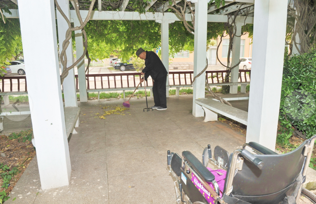 “开始扫地时,我把扫帚和簸箕放在绿化丛中,没曾想,仅过了一周,扫地的工具不见了踪影,以后,我只好每天上午或是中午,提前带着扫帚簸箕和抹布来这里揩擦打扫,在其他老人还没到来之前,扫清长椅地面,揩去鸟虫屎后,再垃圾倒入100米开外的垃圾桶中。”杨文才告诉我。