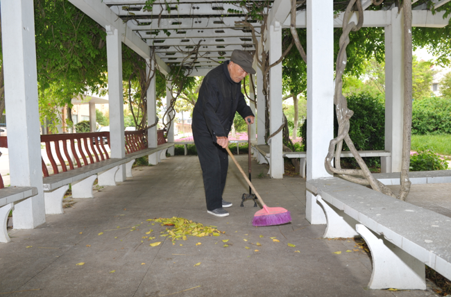“开始扫地时,我把扫帚和簸箕放在绿化丛中,没曾想,仅过了一周,扫地的工具不见了踪影,以后,我只好每天上午或是中午,提前带着扫帚簸箕和抹布来这里揩擦打扫,在其他老人还没到来之前,扫清长椅地面,揩去鸟虫屎后,再垃圾倒入100米开外的垃圾桶中。”杨文才告诉我。