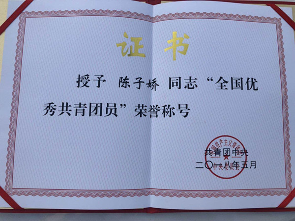 近日,云台农场有限公司共青团员陈子娇获“全国优秀共青团员”荣誉称号,这是共青团中央授予团员个人的最高荣誉,陈子娇成为云台农场历年来唯一获此殊荣的共青团员。