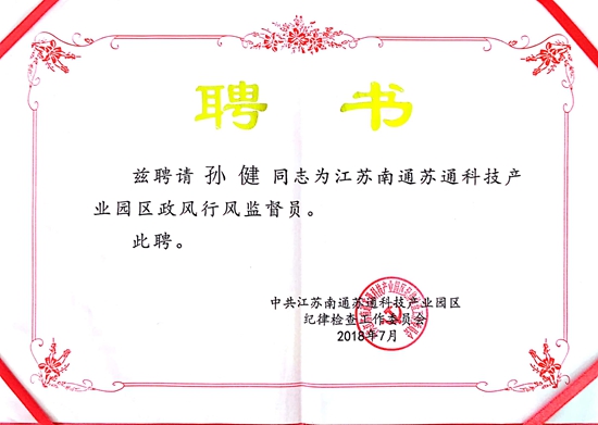 苏通科技产业园区党工委副书记金志伟充分肯定了南通公司纪委工作,对垦地廉洁共建和南通公司纪委工作提出了具体要求。座谈会上,园区纪工委向南通公司纪委书记孙健颁发了苏通科技产业园区行风监督员的聘书。