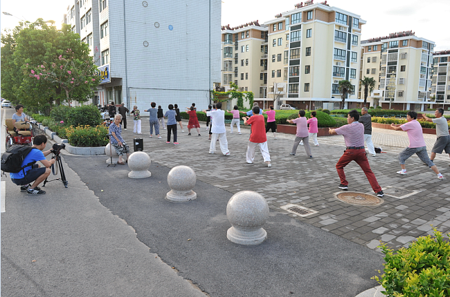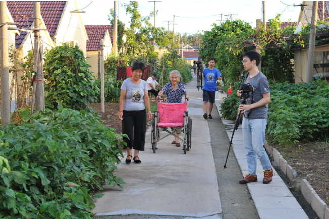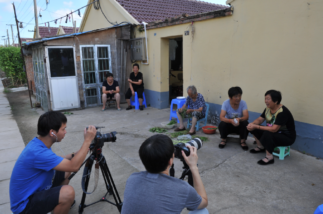 8月20下午-21日,澎湃新闻采访组视频记者朱伟辉、视频编辑龙景和射阳县新闻单位的3名记者在农场宣传部门相关人员的陪同下,用一天半的时间,实时用镜头记载百岁老人从凌晨起床、喝早茶、散步、游玩和吃饭、择菜、做针线活以及与家人、邻居等聊天的情况,感受百岁老人寻常的起居生活。而每拍摄一场老人的生活起居或是生活画面,总是让来自上海澎湃新闻采访组的记者大加赞叹。图为澎湃新闻采访组在拍摄百岁老人生活起居的一组镜头。