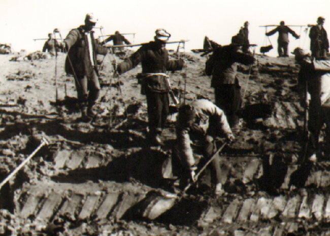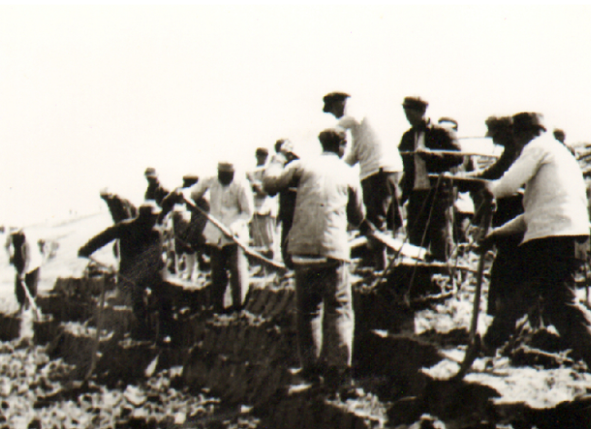 正因为江希友发明的“‘江大锹’挖土法”在全农建四师的成功推广和在水利战役中的优良表现,1953年3月17日,他被农建四师表彰为"特等功臣"。并成为淮海农场建场60周年的10大知名人物。图一是江希友在水利工地作挖沟示范。