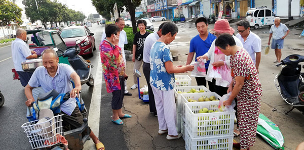自7月15日三河梨园采摘季开始以来,三河社区的6名工作人员便从管理人员的角色转变为“卖货郎”,每天清晨天不亮,修士超、张伟等6名年轻的管理人员便每天坚持将精品包装捡挑余下的四级梨分散到农场农贸市场和周边乡镇的集市去卖,他们街边摆摊设点叫卖的吆喝声吸引得不少大爷大妈的围观并争相购买三河梨,大家一边买梨一边乐呵呵的说,现在的干部可真行,卖起来梨来也是有模有样的。