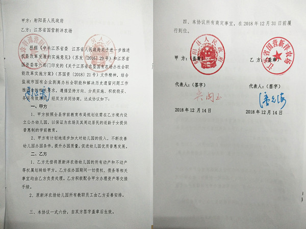 日前,新洋农场与射阳县人民政府正式签订了《江苏省国营新洋农场学前教育移交协议书》,县政府依需在农场境内设立公办幼儿园。