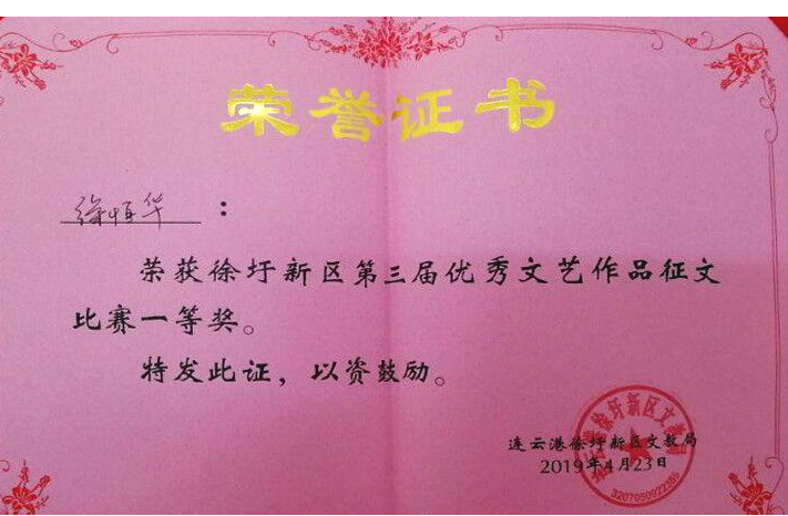 (东辛徐恒华获得徐圩新区第三届优秀文艺作品一等奖荣誉证书)