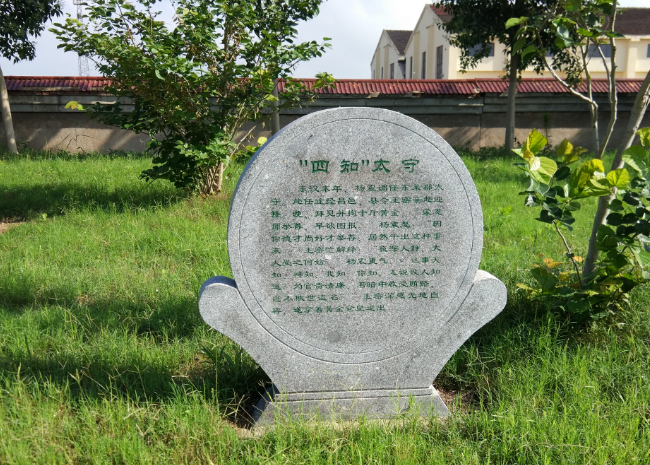在淮海农场淮海廉政公园内北侧的小路旁,有四块镜面圆形的碑石,其中一面碑石上刻着东汉太尉杨震“四知”太守的廉政故事,上面雕刻着“天知、地知、你知、我知”“四知”拒金故事一直被人称颂,为人们所津津乐道。其碑文上面虽然只有短短的140个字,但反映出来的廉政故事和所衍生出来的廉政家风,却为世人代代相传,堪称为政清廉的典范。淮海廉政主题公园在打造的过程中,特地把杨震“四知却金”的故事选入进来,就是配合农场公司在进行军垦传统文化教育的同时,也让人们享受到古时候的为官者清廉执政的形象,更加激发起为民用权、谨慎用权的行为规范。