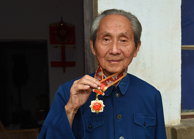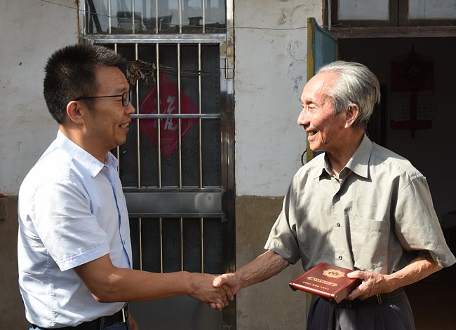昨天下午,家住淮海农场朝阳小区老干部楼95岁高龄的叶崇山老人,依然沉浸在新中国成立70周年的喜悦之中,因为前一天,淮海农场有限公司党委书记单祥忠特地来到叶老的家中,并向老人家递交了“庆祝中华人民共和国成立70周年”纪念章。