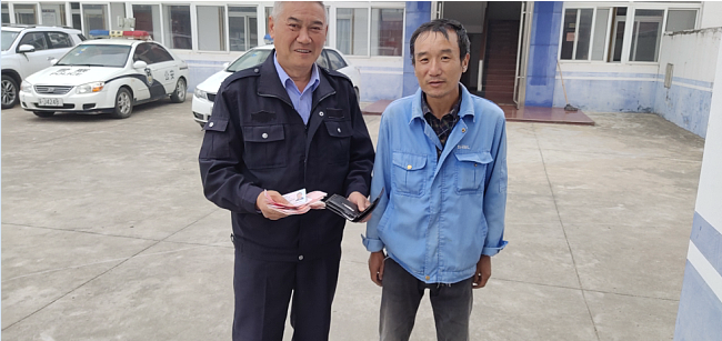 “早上打扫马路时,在社区旁的厕所前捡到一个黑色钱包,打开一看,里边有一沓现金和银行卡。”姜兆华叙说着当时的情况,“我想天刚蒙蒙亮,派出所还没有上班,周围也看不到人,他就继续沿着路途清扫包干区的路面。等我所有路段的工作完成后,就来到派出所来求助寻找失主。”