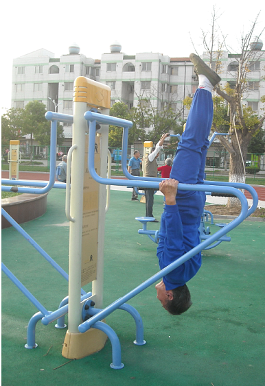 在淮海农场职工休闲体育运动广场的健身器材上,一位头发花白的老人双手拉着双杠,头朝下腿朝上,双腿缓慢上抬,直到伸直为止,一个固定的动作能撑上几分钟。该老人名叫周少彪,今年88岁,他是江苏射阳县淮海农场社区城南居委会的居民,这是笔者看到的情景。不仅如此,已经88岁高龄的他,还就地撑上十几个仰卧撑、在塑胶跑道上进行双腿交叉跑等高难度动作,其身体的柔软程度令人惊叹。