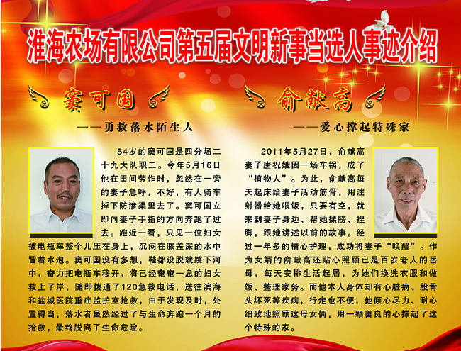 走进淮海农场有限公司机关大门,西侧橱窗上6名文明新事的先进典型赫然在目,细读带有他们头像标志的文明新事事迹,让人不仅产生了发自内心的感动。自今年第五届文明新事在农场公司的第十三届广场文化节上表彰以来,做文明人,践文明事,已经成为了农场公司职工居民的新追求。而举荐和表彰文明新事活动,既是农场公司开展“不忘初心、牢记使命”主题教育的一项重要内容,也是全淮海上下学习先锋先进、激发使命担当的一项重要举措。