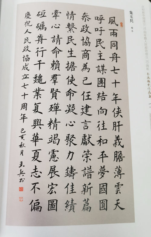 陈颖明的草书《壮丽七十年 奋斗新时代》、陈兰的草书《祖国万岁》、朱玉兵的楷书《风雨同舟七十年》以及张秀亭的画作《长城雄风》、赵文谨的画作《硕果满园》均得到了高度评价,成功入选书画摄影作品集。