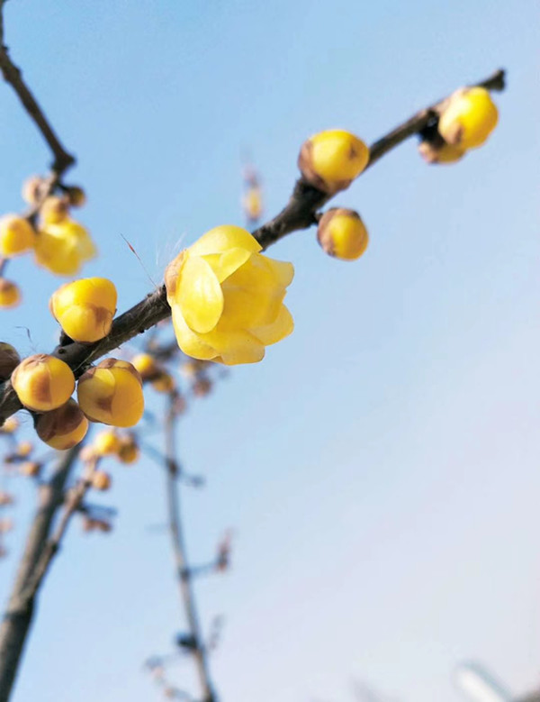 不知道什么时候,惊喜地发现机关楼旁的两株腊梅偷偷盛开了,远远都能一眼看到满树金色繁华。每每路过,我都忍不住在树下驻足,踮起脚尖,贪婪地深呼吸,幽香彻骨,浓而清新,百闻不腻,恨不得一次闻饱了才好。
