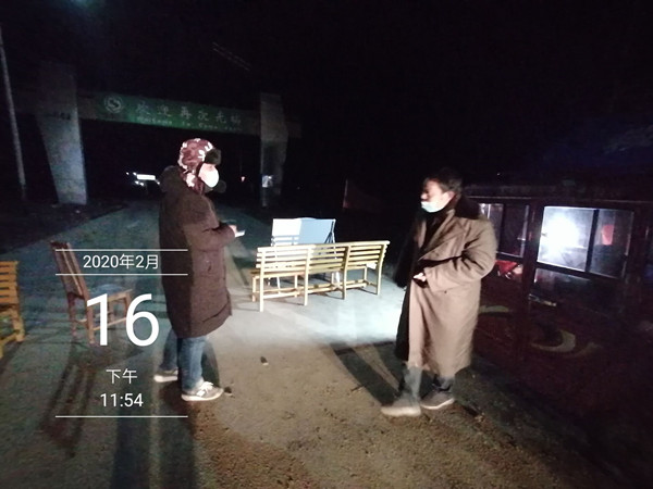 2月16日夜11:46分,在农场西大门防控点,上半夜班与下半班夜正式交接,当晚值零点至早晨六点班的是修士超、陈桂华、王清如,当笔者到达西大门时,他们刚刚交接完毕,远远的寒风中,他们穿着军大衣,深夜的寒风吹的让人瑟瑟发抖,笔者站在冷冷的寒风中,不到十分钟便不停的哆嗦,何况,他们要坚守到天亮。在临时搭建的帐篷里,一张长椅、一箱泡面、一瓶开水便是他们漫漫长夜坚守防控点的“后援”,为了三河的平安,他们借助香烟赶走困意和不时想合起来的双眼,守好西大门是他们心中坚定不变的信念。