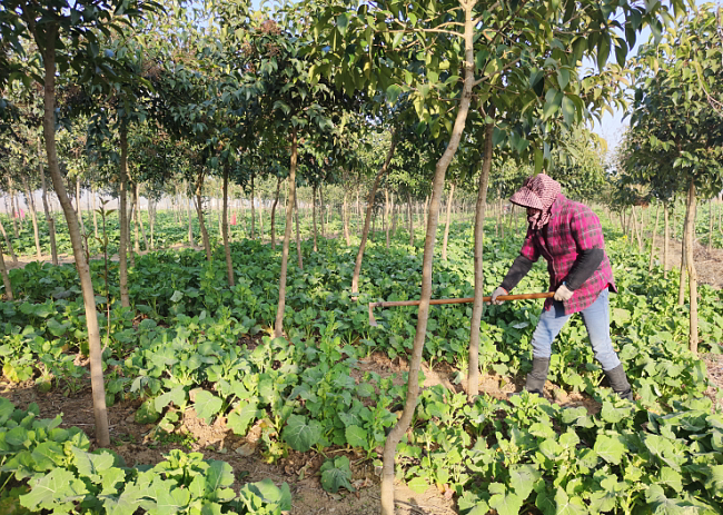 淮海在林地管理中,鼓励职工把精力投入到林下土地的套种增收上,走出了一条林地护林增收的新途径。图为农户在林下对油菜蚕豆田进行锄草时的镜头。