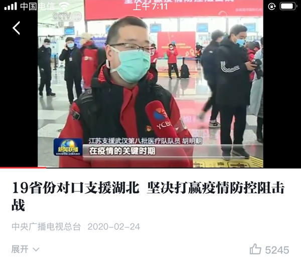 胡明朝接受采访时说:“在疫情的关键期间,全国人民支持,作为一名家乡人,有必要回到家乡,做出我自己的贡献。” 作为江苏支援武汉第八批医疗队队员的胡明朝于2月20日飞抵湖北,支援战“疫”。