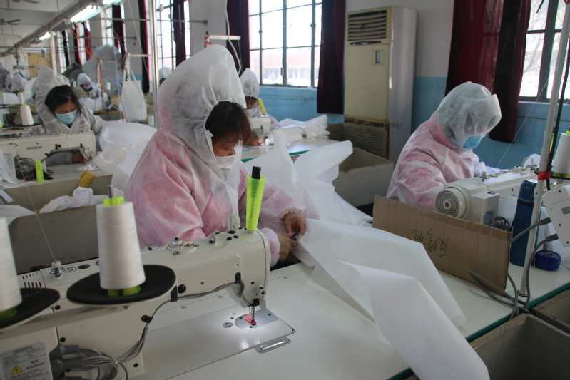 你看我戴的口罩就是我们厂生产的。我们生产的口罩是民用一次性口罩,已通过质检部门检验,有生产许可证,产品供不应求。我来给大家演示一下,你们看,倒上矿泉水后,它并不漏水。用剪刀从一侧把口罩剪开,再用火机烧一下,口罩的内表面都没有异味。口罩是用生产防护服的原料做成的,成本有点高,但质量可靠。”日前,江苏新洋美尔姿服饰有限公司董事长田会玲向笔者介绍说,作为企业负责人,在非常时期,我们积极响应党和政府号召,生产一次性隔离服、口罩等急需的防疫用品,为抗击疫情贡献一份力量。