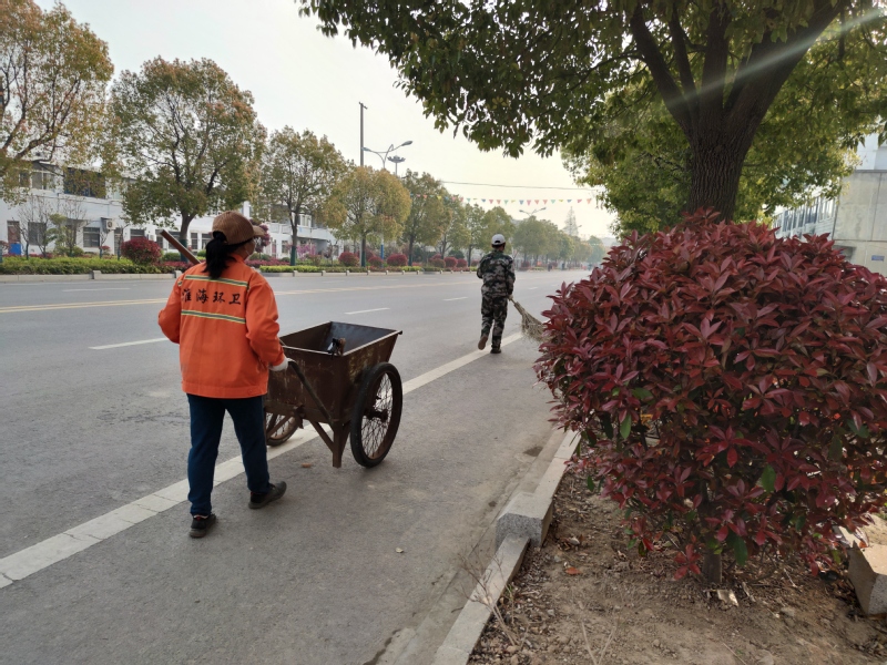 4月14日6时30分,在江苏农垦淮海农场淮海路西侧的大道上,一个身穿迷彩服装的男子,跟随着身穿桔黄色环卫服的妻子,一个手拿大扫帚,一个手推着小推车,依次在淮海路上边走边清扫。他们的身影汇成了每天淮海路上的风景,温馨中饱含甜蜜。