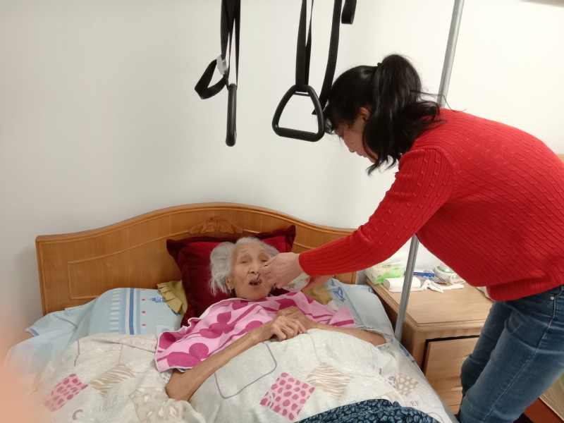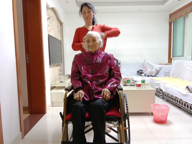 据周元兵讲,他另外的五个哥哥姐姐们或是嫂子女婿们,个个对母亲照顾有加,样样为老人考虑周到,温暖的家庭氛围,这也是我的母亲长寿的一种秘诀吧。图为周粉英在照顾母亲时的一些画面。