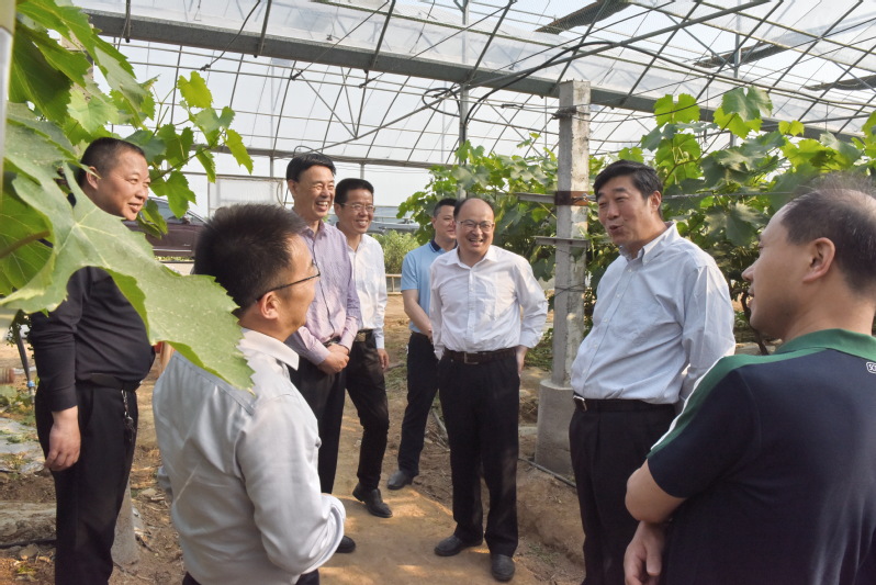 胡兆辉在淮海高效种植园区参观,连栋大棚内青翠的葡萄架下挂满了葡萄。他信步走上前去察看葡萄的长势情况,并详细询问了葡萄的品种及市场生产销售情况,以及淮海其他瓜果苗木的生产情况。他要求,淮海要在产品质量提升、品牌包装和市场拓展上下功夫,争取创造更大的市场。