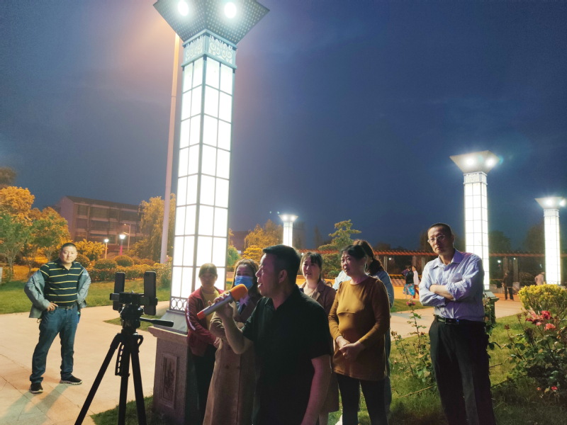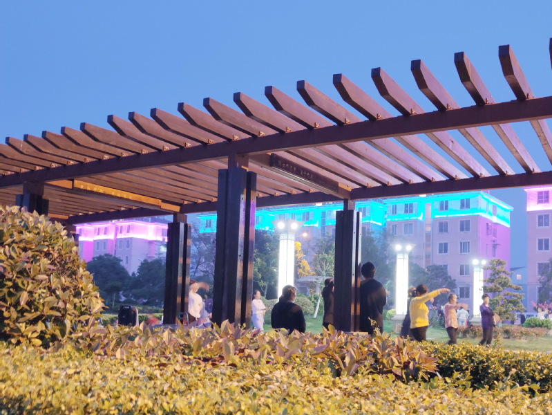 随着夏季的来临,每当人们吃完晚饭,在淮海农场淮海公园内就是别样的风景。这时晚霞余辉西下,夜幕降临,公园内变幻的灯光闪烁,色彩斑斓,让公园内的绿植、设施和灯光融合在一起,非常漂亮。