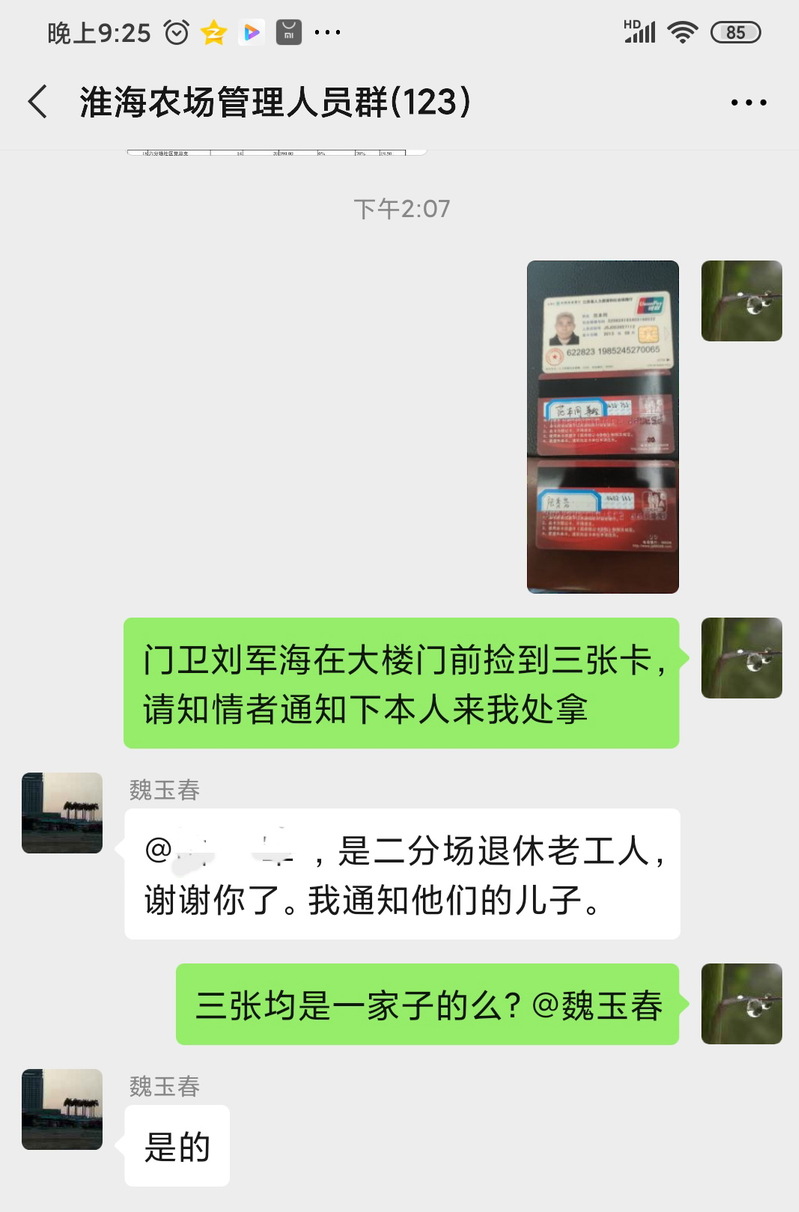 对刘军兵的善举,我们表示了肯定,于是立即就把这三张卡拍了照,上传至淮海农场管理人员工作群中,并注明请认识丢失卡的同志进行转告。迅即,二分场干事魏玉春看到信息后,就有了回应,说丢失卡的人是他们二分场社区的,已经通知老人的儿子前来认领。