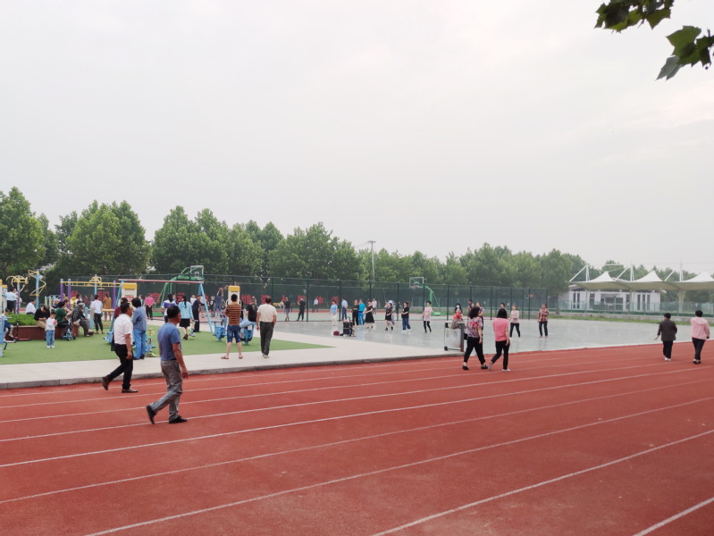 振兴路茂密的梧桐树下是一片清凉,透过“发展体育运动 增强人民体质”的红色标语牌望去,职工休闲体育运动广场上是人流如织,塑胶跑道散步、篮球场上追逐、门球挥杆运动、舞蹈池间翻飞、运动器材健身,人们在各自喜爱的平台上运动健身,这是一幅和谐温馨的生活画面。笔者在淮海采访,体验着、回味着农场职工居民诗意般的社区生活,也近距离地享受社区居民惬意的一天。