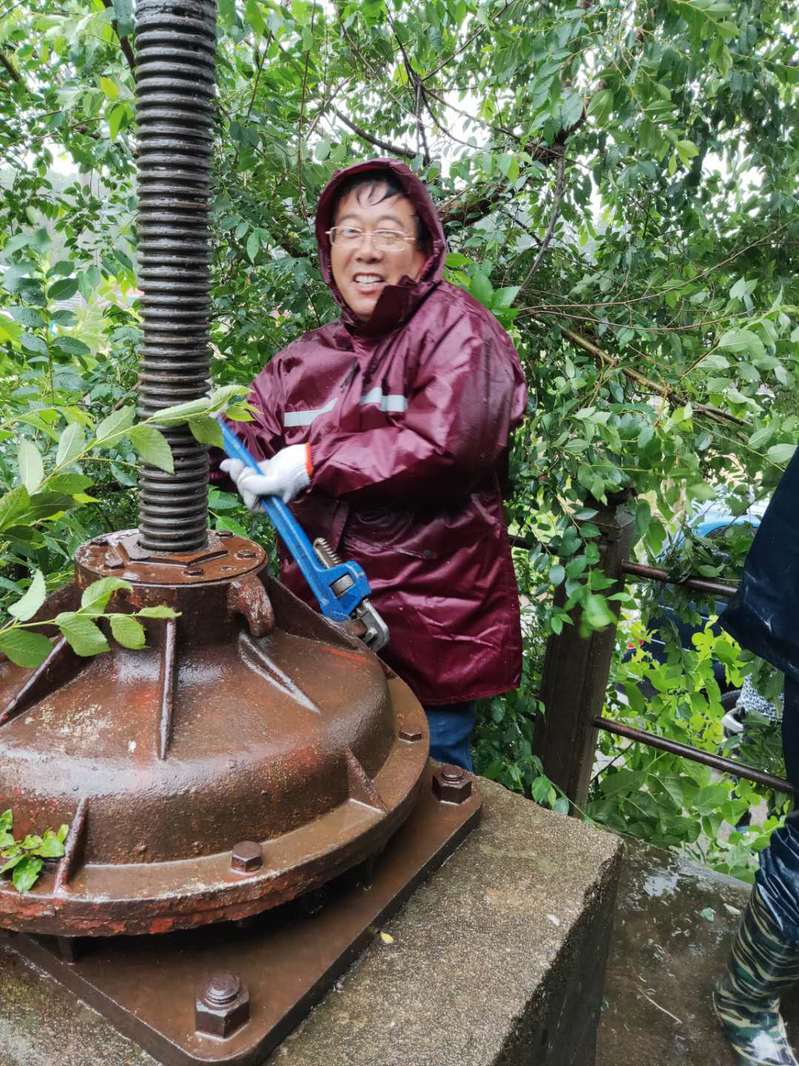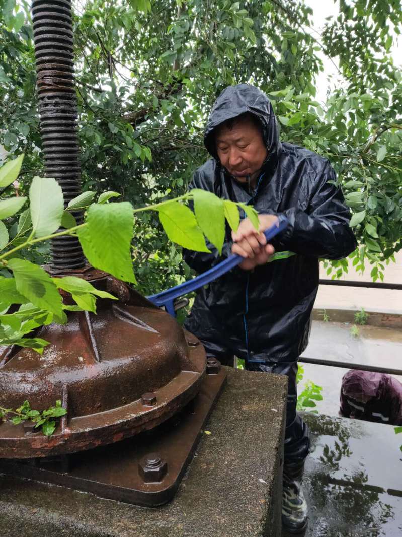 农水中心主任何成就带领农机总站一行7人临危受命冒雨前往小木闸。小木闸是农场刚建成时建立的河闸,肩负新洋农场的抗洪排涝任务几十年,在农场新建成电动河闸后处于退休状态,原本的电机已经拆除,升降闸门的螺杆也已生锈。如果不是这次雨来的太猛,小木闸本可以如一个退休的老人一样静静地看着新洋蓬勃发展。