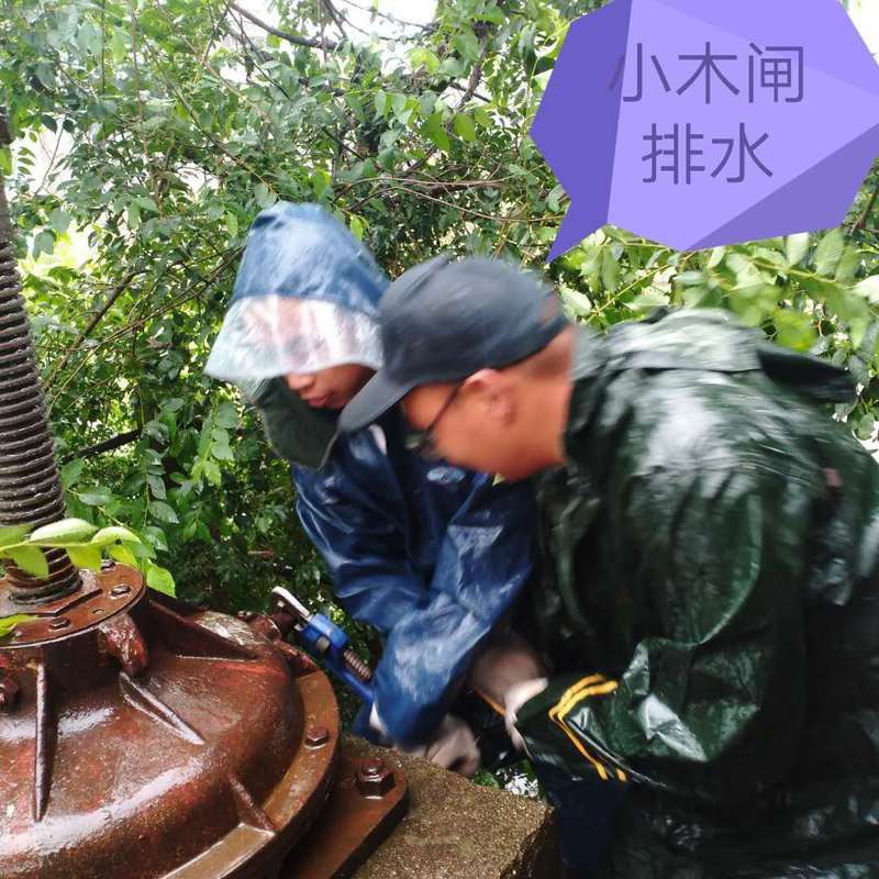 7人中有5人是农发二支部的党员同志,当他们冒雨赶到小木闸,发现要升起一大二小三个闸门只有靠人力一圈一圈的转动升降螺杆时,没有多余话语,立即分工合作。何成就、万罡、李少金三人用管子钳转动两个小闸门的螺杆,徐扬、王光轶、周旭明、陈中顶四人合力用撬杠转动中间的大闸门。闸门大而沉重,只有减速机的高转速比才能通过人力转动小齿轮带动大闸门。经过估算,大约转动200圈闸门升起2cm,要想闸门完全升起离开水面大约需要提升2m的高度,这就大约需要转20000转,所以四个人轮流上阵转动小齿轮,一刻不停,就这样从早上8点转到下午4.30,终于将大闸门升离水面。小闸门也是同理,三个人轮换,一个人累了就换下一个。7人从早上7点接到命令,一直干到下午4.30终于完成泄洪任务。看着升离水面的闸门,看着渐渐下降的水位,7个人虽然累的手抬都抬不起来,但是心中有满满的成就感。