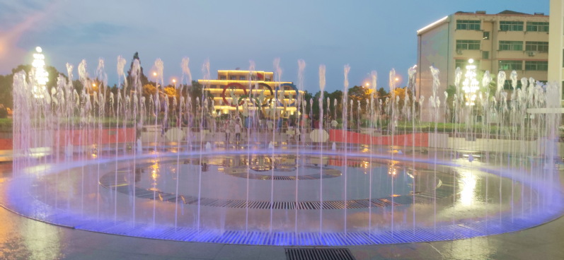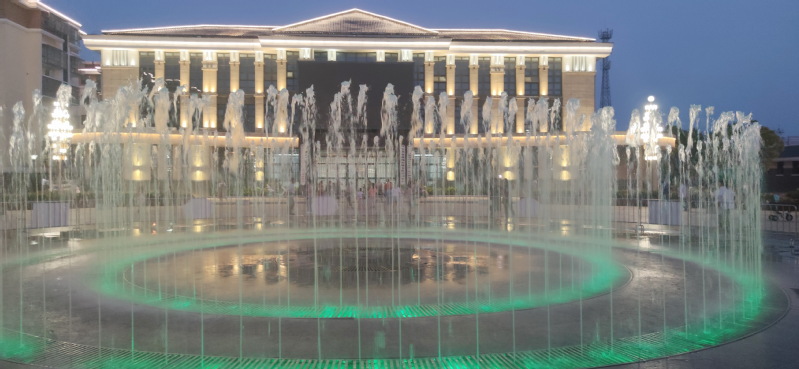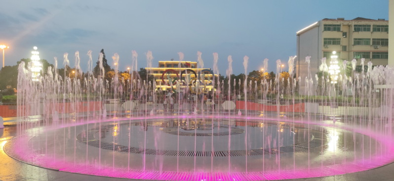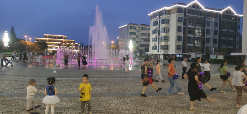 在淮海农场文化广场中心区域的喷泉位上,每天傍晚时分,这里的音乐喷泉总是给农场的夜色增添了变幻着的迷人风景,能变换许多种造型的大型音乐喷泉,时而一柱冲天、时而万马奔腾、时而此起彼伏、时而柔性十足,并且音乐喷泉在周边楼宇的灯光和职工居民舞蹈动作的映衬下更加唯美、更有动感、也更有了灵气。每到夜晚,喷泉在音乐声中翩翩起舞,色彩斑斓。受此喷泉吸引,农场职工居民喜欢在音乐喷泉旁载歌载舞,喜欢围着音乐喷泉拍照留念。而这里更成为了孩子们追逐的天堂,通过近距离地欣赏音乐喷泉的美景。不同的需求、不同的美景、共同的快乐,让大家在音乐喷泉的风姿中,度过一个又一个快乐的夜晚。