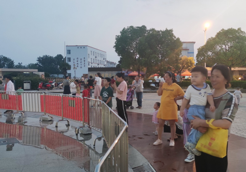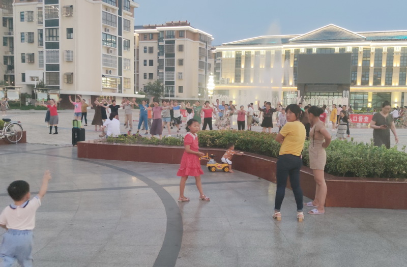 每次我们上体育运动广场上的健身器材上去健身后再路过这里,孙女就非要拉着你的手来到这里看音乐喷泉,并且这里的孩子很多,于是就让孩子们吸引过来。”淮海学校老师周永林说,“看到孙女玩得高兴,我们听的看的也非常开心,农场的健康体育文化广场,也为我们生活添加更多色彩欢乐。”图为淮海文化广场上职工居民在活动时的镜头。