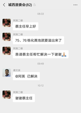 “蔡主任早上好,75、76栋化粪池就要溢出来了,恳请帮忙解决一下,谢谢。”7月27日早上8点半,新洋农场城西居委会微信群里,居民向居委会主任求助。