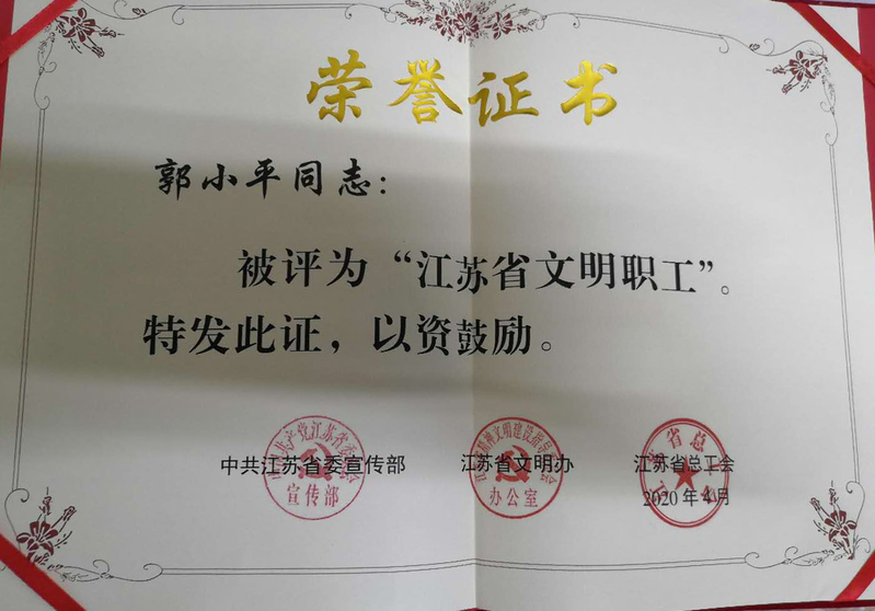 日前,中共江苏省委宣传部、江苏省文明办、江苏省总工会联合发文命名“江苏省十佳抗疫职工”、第十七届“江苏省十佳文明职工”和“江苏省文明职工”,新洋农场有限公司水电管理服务中心主任郭小平获评“江苏省文明职工”荣誉称号。多年来,郭小平积极践行社会主义核心价值观,是爱岗敬业、技能精湛、品德高尚、遵章守纪的先进职工典型代表。