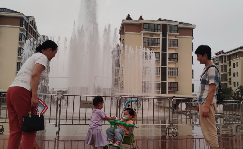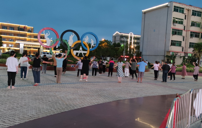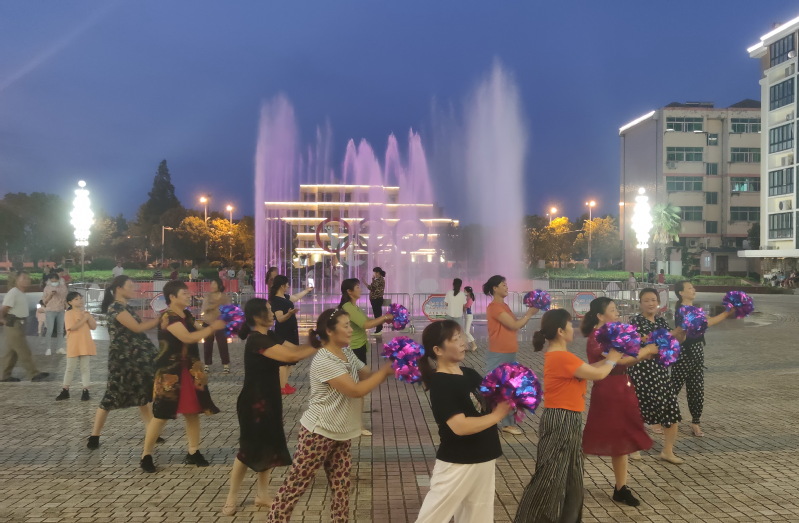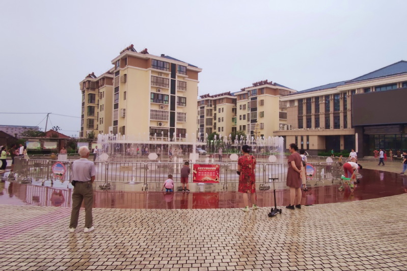8月10日傍晚,在淮海农场社区门前的文化广场上,喷泉栏杆上的社会主义核心价值观和文明创建标语也非常醒目,栏杆内不断变幻的音乐喷泉旁,吸引了一波又一波的孩子前来观看。农场社区的职工居民此时也纷纷来到了文化广场上,进行健身运动。一些孩子和家长正在周边游玩得兴起,一派和谐而又温馨的场景洋溢在大家的心头。
