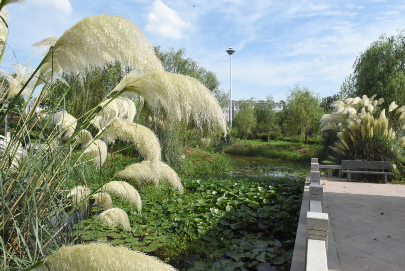 在孩童时节,我们在上学途中,常在蒲苇草间穿梭、躲藏,特别是在开花季节,我们常攥着那毛绒绒花序,抚摸玩耍。那个年代蒲苇草在林间地头和坡河坎上生长了许多,其高大的植株,绽放的芦花,在野外看来甚是美丽。长长的蒲苇草常被妈妈割回家,晒干后用作包裹粽子用的绳索,结实得很。如今,农场把这一草本植物通过引进种植在职工群众游乐休闲的淮海公园内,就是把她那轻盈飞扬,飘逸洒脱的姿态植入公园,让人在丰富遐想和游玩的同时,打造出新的景致,如今看来,蒲苇草果真不凡,在开放季节更是别有一番韵味。
