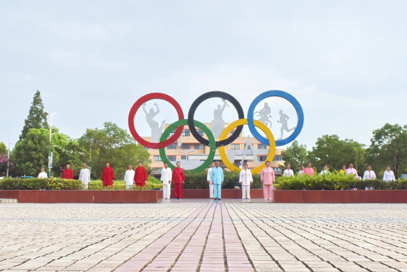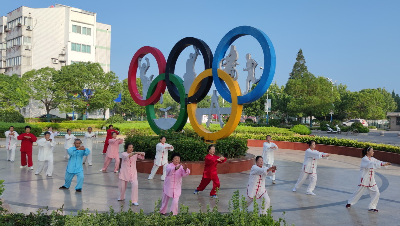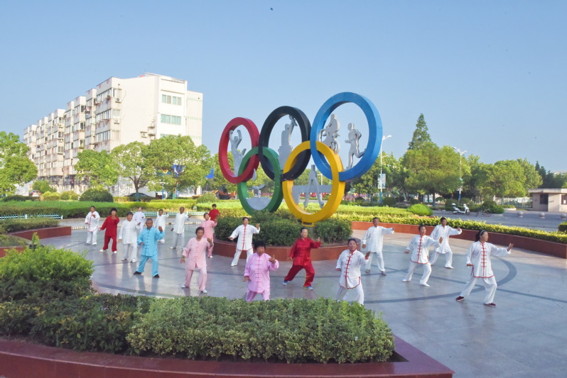 静静地坐在亭子里看老年人挥打的太极拳,让人感到他们具有运动的美。它像流动的诗,立体的画,精彩绝伦,它动中带静,静中有动,动作舒缓,姿态优美,把老年人的身体展现成轻灵活泼的身段而连绵开来。这些太极运动与身旁鲜艳的五环雕塑色彩,与广场上貌美的周边环境融合在了一起,成为淮海清晨一道最为亮丽的风景。