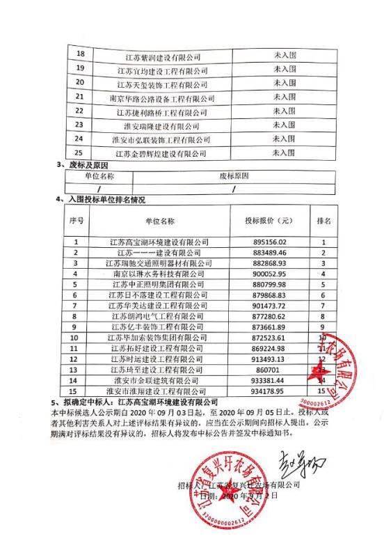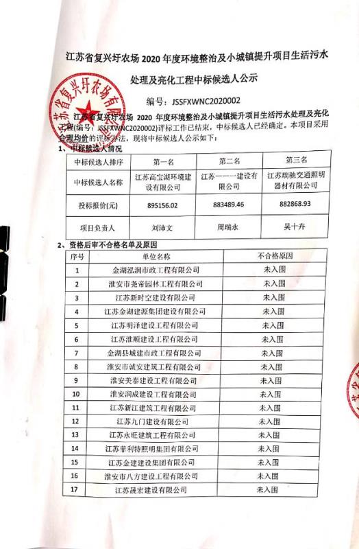江苏省复兴圩农场2020年度环境整治及小城镇提升项目生活污水处理及亮化工程中标候选人公示