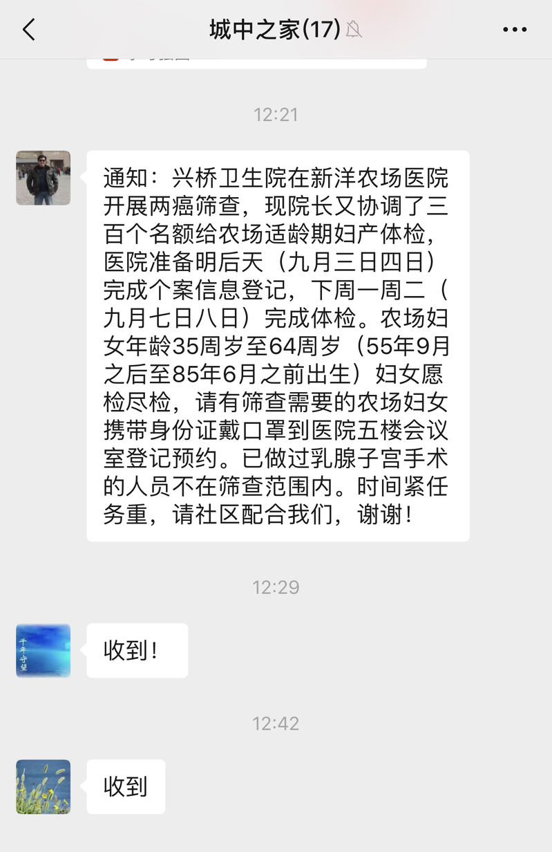 据悉,宫颈癌和乳腺癌在女性患肿瘤中分别居于第一、第二位。活动期间,农场公司宣传部门在电视、广播中循环播放两癌筛查活动注意事项和体检时间事宜,做到惠民政策家喻户晓、人人皆知,为该活动的顺利开展提供了坚强的舆论保障。
