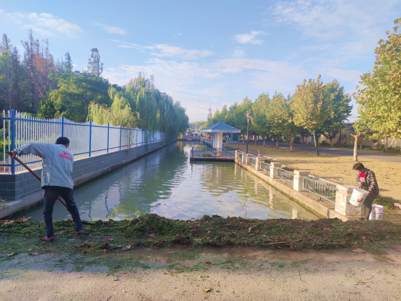两天时间在清除浮萍的过程中,不但河道里面没有了绿色污染物了,更重要的是水变清了,环境变美了,农场的小城镇也变得更加漂亮了。图为环卫人员在清除浮萍和河道清洁后时的镜头。