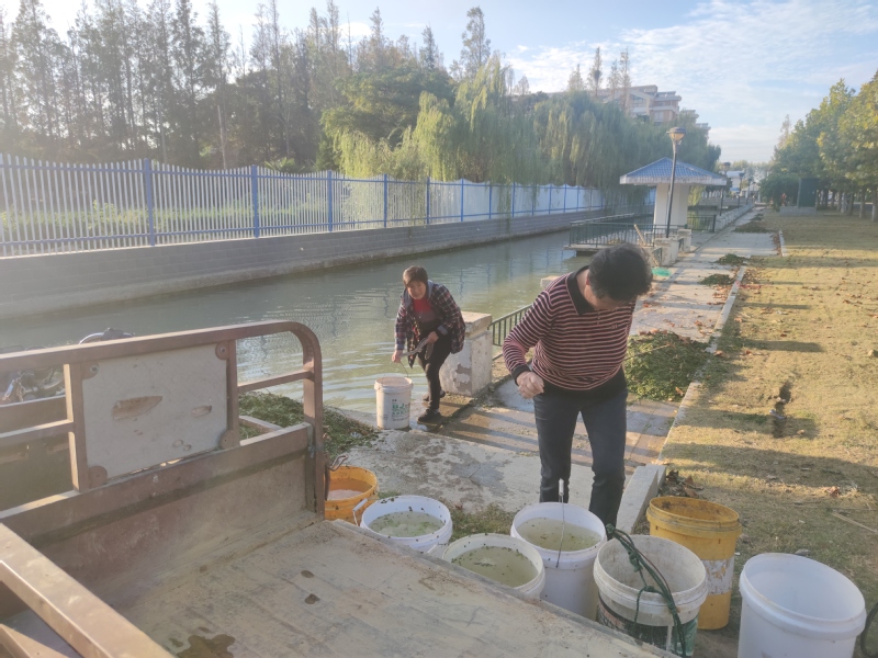 “浮萍没有了,河水也变清了,我们也好拎水浇地了。”唐淑兰等姐妹俩推着平车来到河边拎水时说,“现在河道经过疏浚和捞浮萍整治后,不但农场的河道内的水循环了,水也不臭了,更主要的是水也变清了,这种环境下河道内的鱼就更多啰。”
