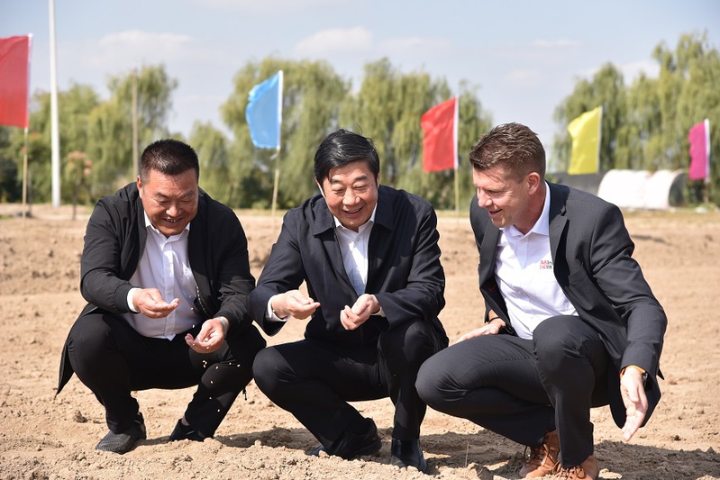 签约仪式后,双方共同前往观摩大麦现场播种,江苏农垦、百威亚太以及农民代表共同播下希望的种子。