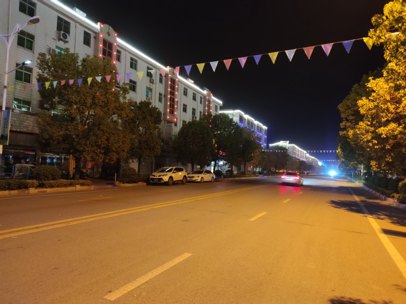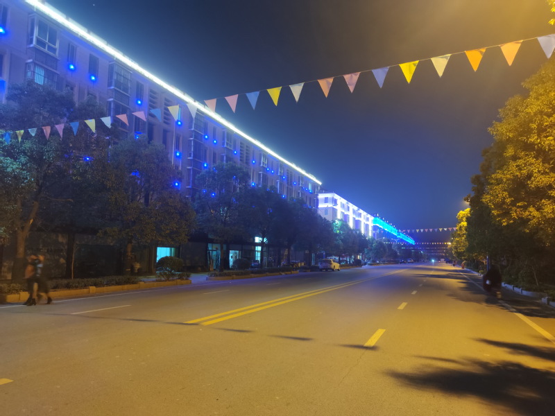 淮海路是农场的主干道,四车道的道路加上两边的停车线就有近30米,两边香樟树茂密,紫薇花装点,红叶石楠搭配,路灯中的彩旗穿插其间,营造出了优美的淮海路绿化环境。农场的建设者们,为了让农场的夜色更有亮点和特色,也让生活在这里的人们更有幸福感,通过夜间楼宇的亮化工程,让道路两边及文化广场周边的楼宇轮廓灯、星灯、招牌灯、射灯及霓虹灯绽放在夜空,十分漂亮和养眼。