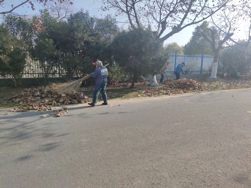 为了较好地完成飘落树叶的清扫工作,农场绿化环卫所一是采取分段保洁和突击清扫相结合的作业模式,在平时树叶飘落较少时,发挥各分管路段环卫职工的力量,进行一定频次的清扫工作,保证道路的保洁度;当大风降温下雨落叶量较大时,采取集中环卫力量,突击进行清扫的方式,巡回收集,确保树叶随落随清,然后通过机车拖运填埋处理,减少树叶的飘荡和对环境影响的加剧。特别是做好重点路段的巡回保洁工作,对落叶相对集中的振兴路、群乐路、创业路等路段进行重点清扫,做到随扫随清随洁,同时对落叶多的路段增加人员打扫频次,加大清理督查力度,强化清扫保洁质量,让落叶不再成为农场美丽环境的污染源。图为农场绿化环卫所的职工在振兴路上最后一次清扫落叶时的镜头。