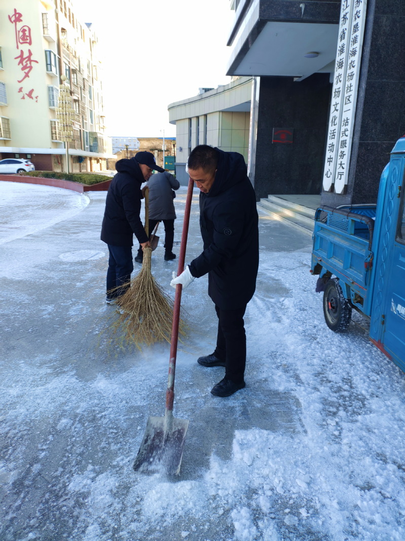 12月30日一上班,农场社区里的全体工作人员,但自发地找到各种扫地铲雪用具,组织加入到门前的一场扫雪攻坚战中来,大家不畏严寒,纷纷拿起扫把、铁锹等扫雪除冰工具,清扫社区“一站式”服务大厅门前、东西出入口便道以及连接农场学校、居民小区路道上的积雪。
