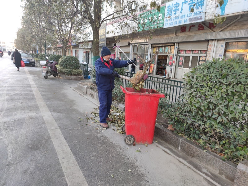 由于前期农场遭受到了零下十一二度的冻害,加上近期太阳较好,被冻死的香樟树叶迅速失水干瘪,特别是淮海路栽植的香樟树较大较多,落叶堆积较多,为进一步提升了农场小城镇的形象,为即将来临的新春佳节营造出良好的环境氛围,近日来,淮海农场绿化环卫所不但加强了沿路环卫职工对树叶等杂物的清扫力度,还组织环卫职工开展突击清理绿化带内的杂物垃圾,作业人员利用专门订制的“钉耙”扫帚或是夹剪将杂物捞出,然后用编织袋统一装袋,集中运走,为生态美丽淮海营造出亮丽的色彩。图为环卫职工们在清扫路面时的镜头。