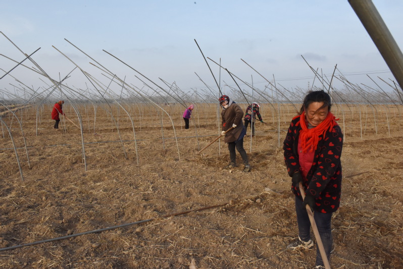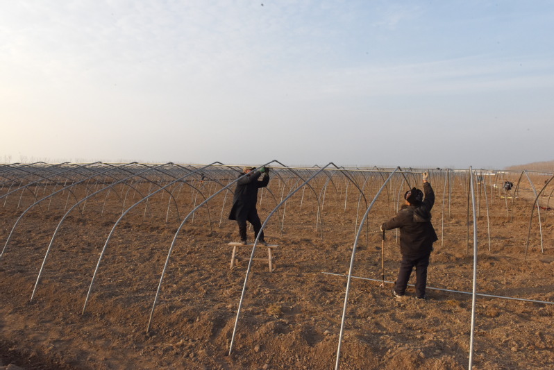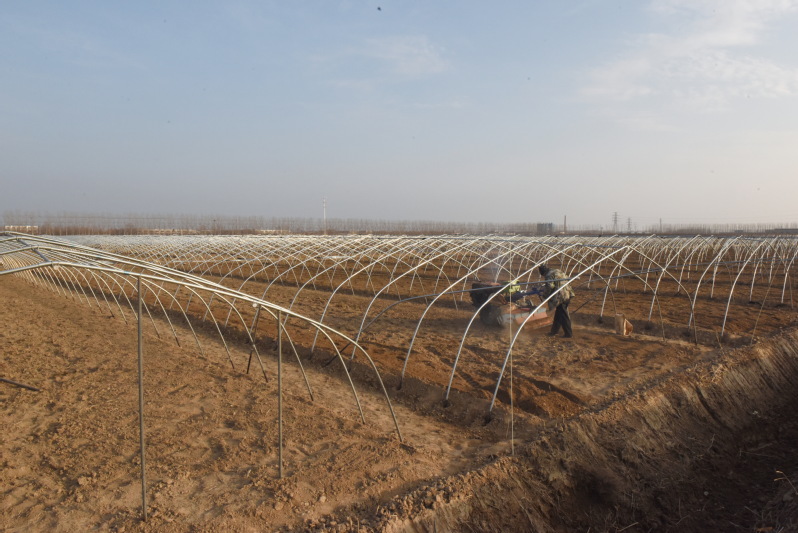 大面积连片在淮海进行的西瓜种植,不仅让怀揣技术、经验、资金和市场的淅江瓜农借助农场小城镇的集聚效应,借助充足的劳动力获得增收的红利,同时西瓜地大棚搭建及今后棚内的各种管理措施,可以较好地带动农场的职工居民和周边农村的群众,借西瓜种植基地的繁育种植和市场销售,而实现他们在“家门口”打工创收的梦想,有力地带动了广大职工居民和农村群众借农机和劳务来实现增收。图为职工群众在大棚基地里进行劳作时的镜头。