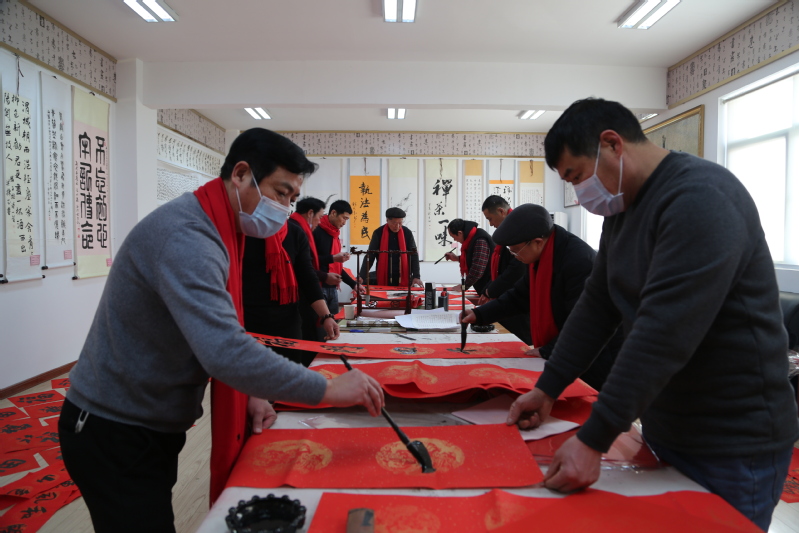 一大早,志愿者们不顾寒冷的天气,早早地来到岗埠新时代文明实践中心二楼的书画室,直接开始写春联、写福字的活动。志愿者们挥毫泼墨,展众家所长,用心用情书写春联,展现了志愿者们深厚的书法功底,大家不辞辛苦写作不停,不一会就将书画室的桌子、地上铺得满满的。红色的春联和福字,与节日主题交相呼应,营造了浓浓的节日氛围。