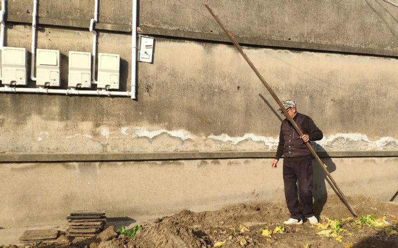 图为老党员李宗加将最后一根蔬菜爬藤架子拆除移走