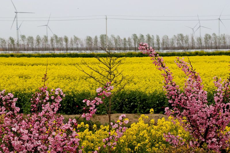 “凌寒冒雪几经霜,一沐春风万顷黄。”在经历了冰凌霜雪的严酷磨砺之后,沐浴着和煦的春风,和着春天的旋律,油菜舒展了一下身姿,昂首吐出了芬芳。油菜花开了,开得那样热烈,开得那样奔放,开得那样灿烂,开得那样浪漫,金灿灿的,黄澄澄的,金得耀眼,黄得诱人,春风中摇曳着少女般的身姿,几许矜持,几许妩媚,水一样的柔情,火一般的热情。看,田间、沟坎、河岸、路边、林间、家前、屋后,一片片、一垄垄、一簇簇,流金溢彩,芳香浓郁,在明媚的春光中,荡漾着勃勃的生机,涌动着春天的情思,与青青的麦苗交相辉映,与粉红的桃花、雪白的梨花一起竞相开放,将大地装扮得五彩缤纷,分外妖娆,赏心悦目,令人心旷神怡。